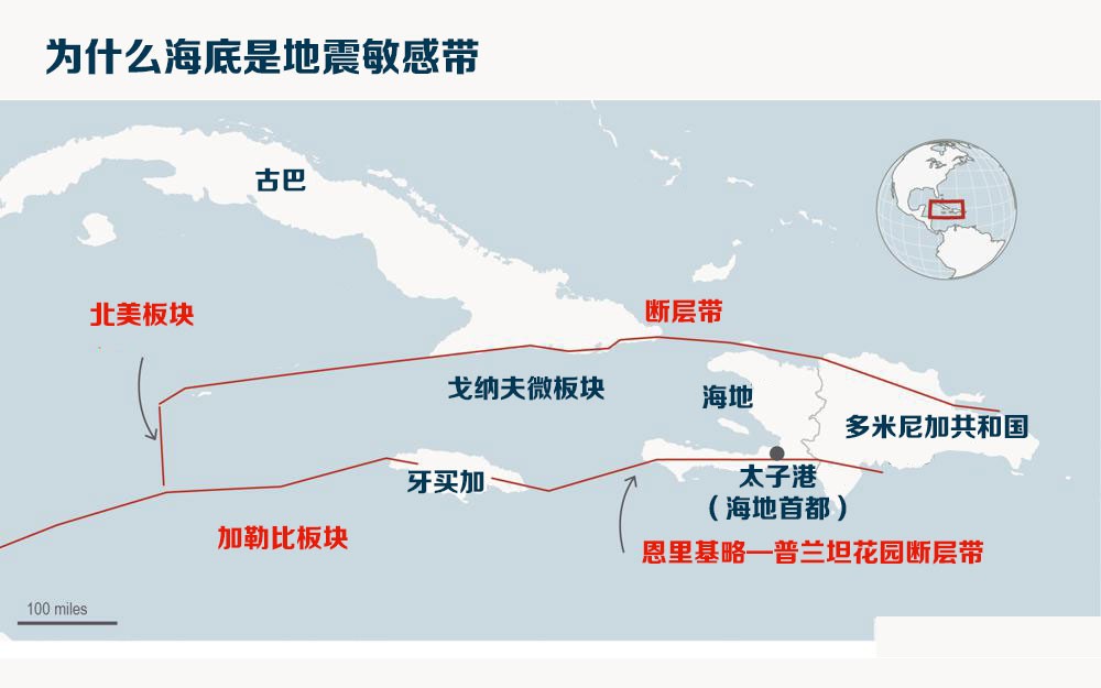 为什么海地容易发生地震?美联社解释道,地壳由移动的板块组成,而海地恰巧位于两大板块——北美板块和加勒比板块的交汇处附近。