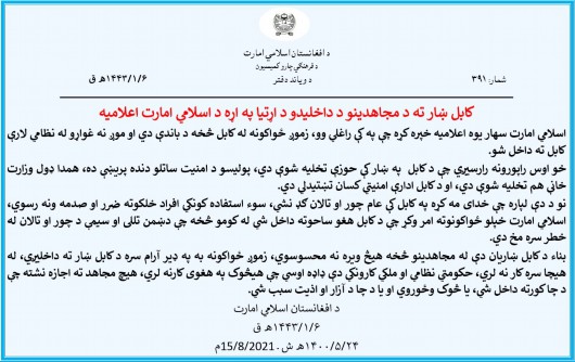 声明中表示,喀布尔各行政区已被解散,警方已停止安保工作,政府安保人员也已撤离。为维护社会治安,该组织决定批准武装人员以“和平”方式进入市区,同时呼吁喀布尔市民放下担忧。(来源:总台亚非中心)