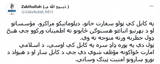 塔利班发言人:驻阿富汗外交机构和外籍人员将不会面临任何危险