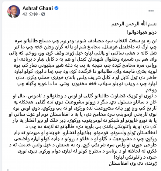 阿富汗总统加尼发布社交网站动态 称为避免流血已离开该国