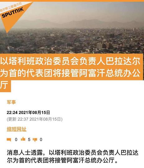 据俄罗斯卫星通讯社当地时间15日报道,消息人士透露,以塔利班政治委员会负责人巴拉达尔为首的代表团将接管阿富汗总统办公厅。