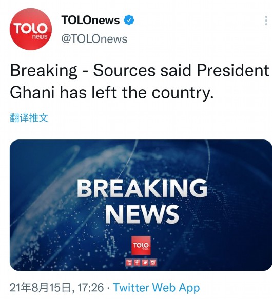 据阿富汗黎明新闻当地时间8月15日报道,阿富汗总统阿什拉夫·加尼已离开该国。(总台记者 李霜溪)