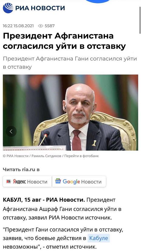 另据俄罗斯新闻社(RIA)8月15日报道,阿富汗总统加尼同意辞职。
